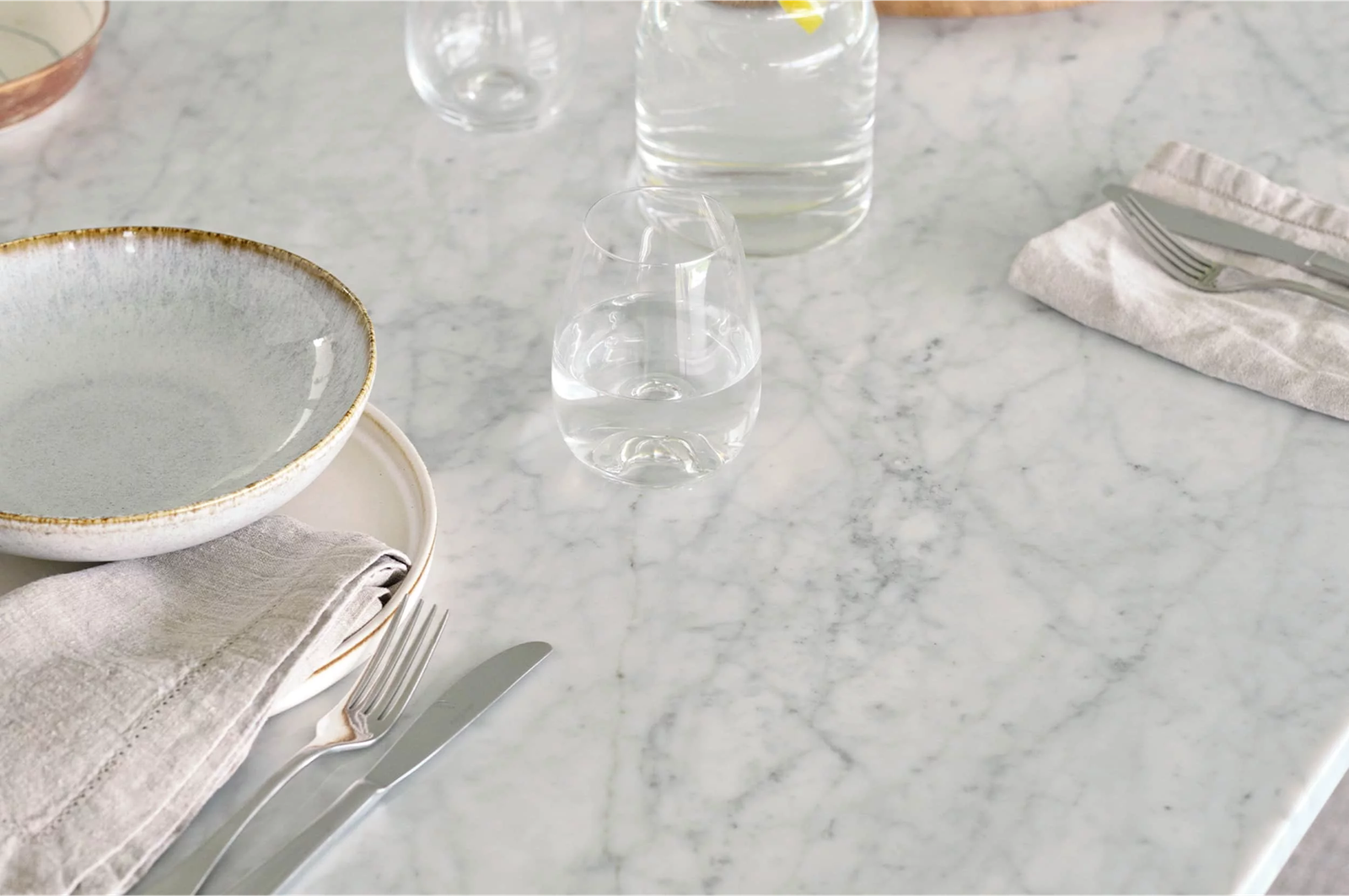 Carrara marble top adds a sense of refined luxury to your dining space.